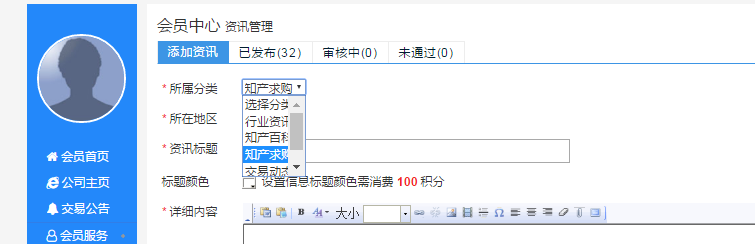 在求購頁面請根據您的需求選擇分類(知產求購),然后輸入求購關鍵字、用途、預算、類別、詳細描述、聯系方式即可提交發布需求。