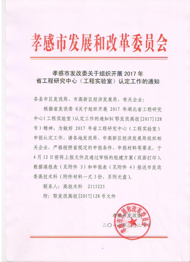 孝感市發改委關于組織開展2017年省工程研究中心(工程實驗室)認定工作的通知