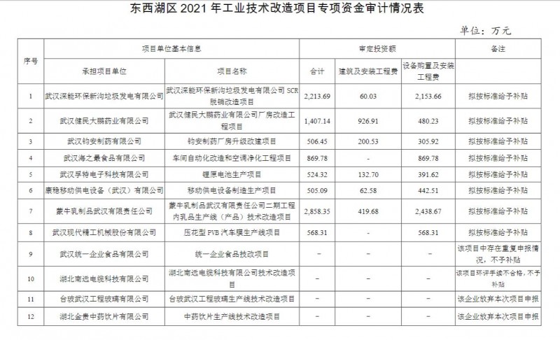 東西湖區2021年工業技術改造專項補貼資金審計情況公示