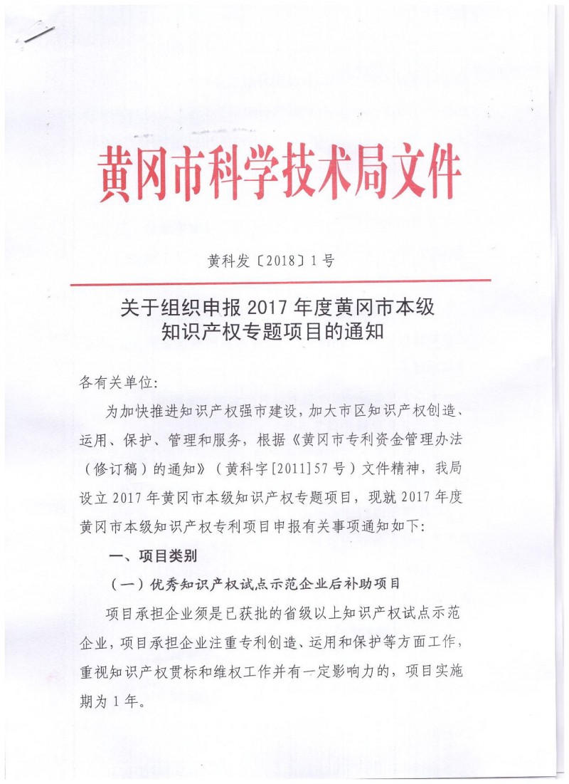 關于組織申報2017年度黃岡市本級知識產權專題項目的通知