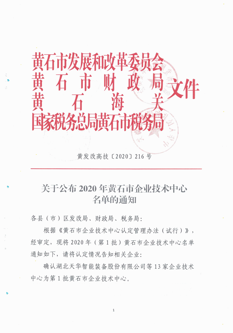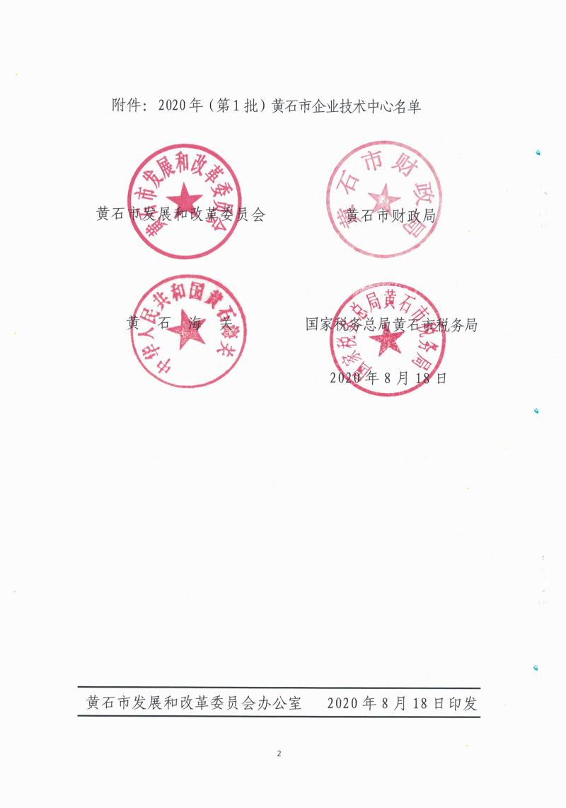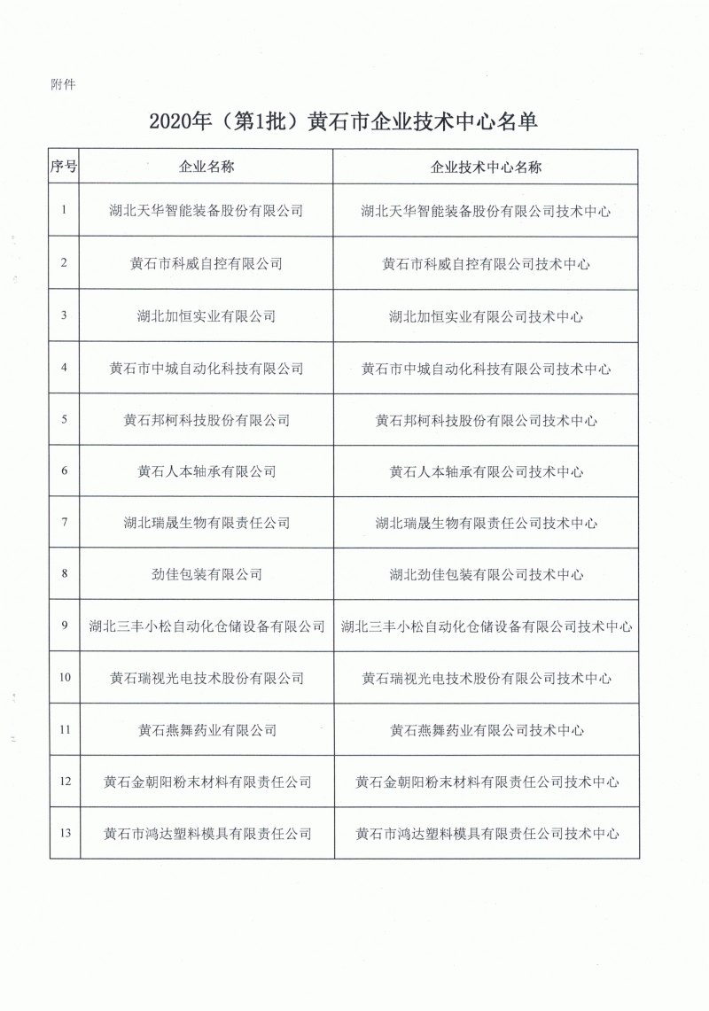 2020年(第1批)黃石市企業技術中心名單公布